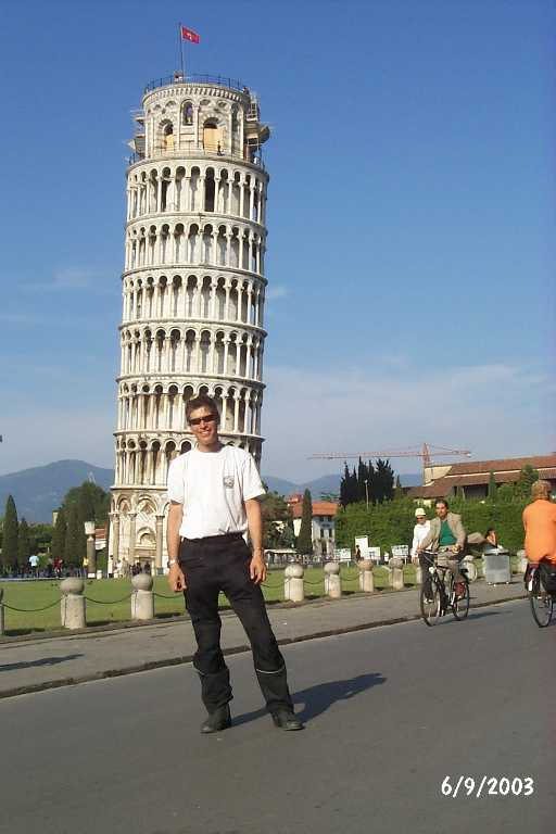 "תראה, הבניין עומייד או לא עומייד" (שמואל רודנסקי לשמוליק סגל במערכון על בית ההסתדרות" לאחר נסיעה אורכה וקשה, מגיעים לפיזה. בינתיים לפי התכנון. שעות אחר הצהריים המאוחרות. מחפשים מלון שלצערי אין כי כולם מלאים. אז עוצרים ליד הכניסה לשטח המפורסם להתקרר, שותים הרבה ונחים לכמה דקות. עכשיו ככה, אני יודע שאלו מכם שלא היו בפיזה בטוחים שכשמגיעים לשם הדבר הכי בולט זה המיגדל והמבנים המקסימים. שכחו מזה. הדבר הכי בולט זה הרוכלים, הדוכנים, הנוכלים, הכייסים ושודדי התיירים (שודדים חוקיים - כאלו שמוכרים שעוני רולקס "אמיתיים ב-10 יורו"). זה כל כך מגעיל שאם יש לכם תכנון להגיע לפה, קחו אוויר, תתרכזו במשימה ו"תחתכו" דרכם פנימה דרך השערים. ואז בא המגדל המפורסם. מה אני אגיד לכם? אצלנו בונים יותר טוב.... (הייתי חייב). הבניין עדיין עומד. לא, לא ישרו אותו. אבל חיזקו שלא יפול. השמש שפונה לים יוצרת ראות מקסימה על האזור ואני לא רוצה לזוז. גדעון בחוץ שומר על האופנוע ככה שאני מקצר ויוצר אבל חוזר שוב ומסתובב קצת עד שמתחילים להסתובב באזור טיפוסים מפוקפקים. עוד הצצה, והחוצה. ואז נזכר במדבקות. ברב האיזורים הקלסיים נמנעתי, אבל פה? אם כל הטינופת? איך לא? על הכניסה! שימו לב בבקשה לשלט, בצידו הימני התחתון. חרף העייפות, מושך להמשיך לפירנצה הערב. עוד כ-100 ק"מ. ב-11 מוצאים מסעדה שגעון בהמלצה של איזה בחור מסיציליה שדיברתי איתו. בכלל, עד עכשיו הצליח לי עם מסעדות. מחר אני אקום עייף עם גב כואב. |